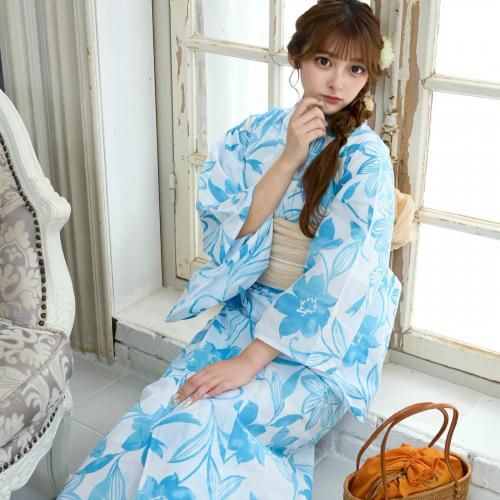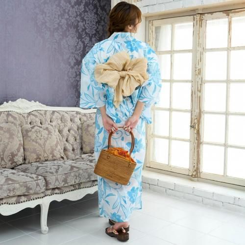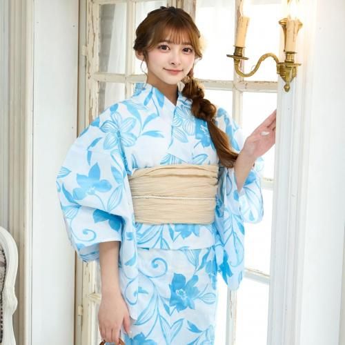 清々しい白の地に水彩画のようなブルーの花々が連なる浴衣3点セット(YUKATA)