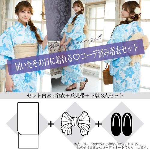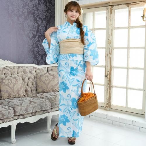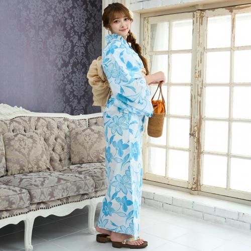 清々しい白の地に水彩画のようなブルーの花々が連なる浴衣3点セット(YUKATA)。