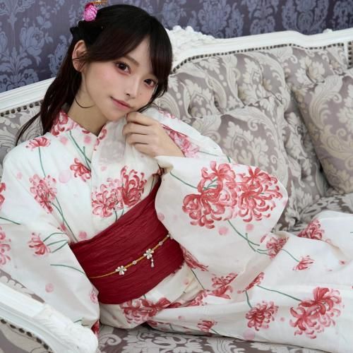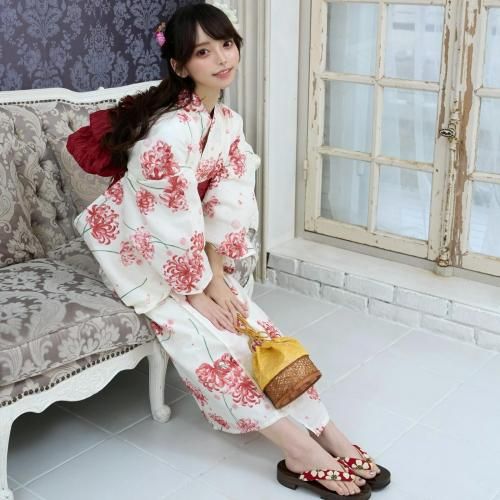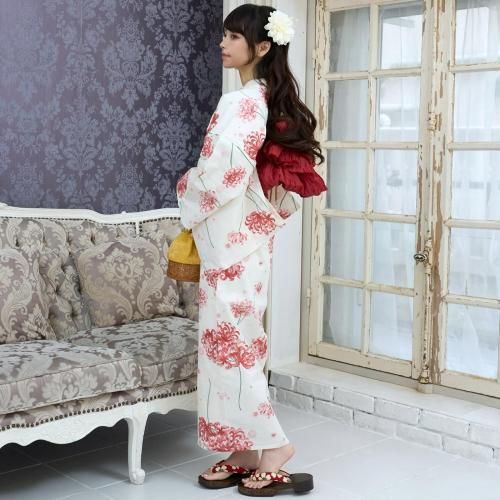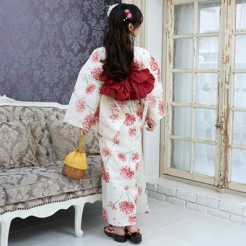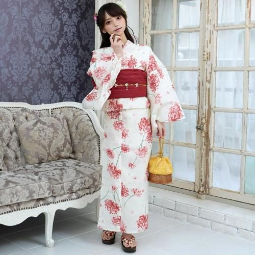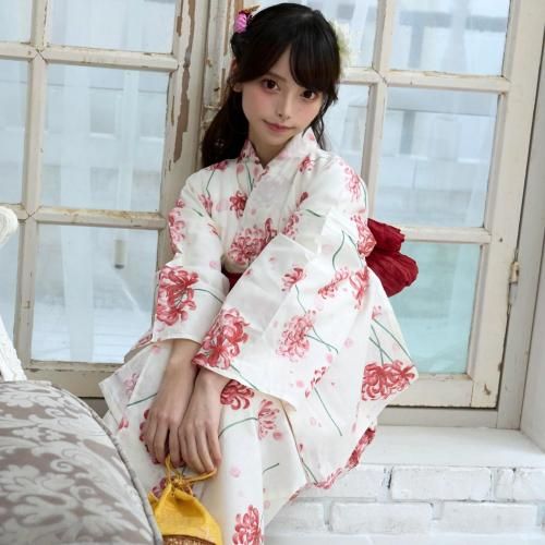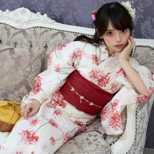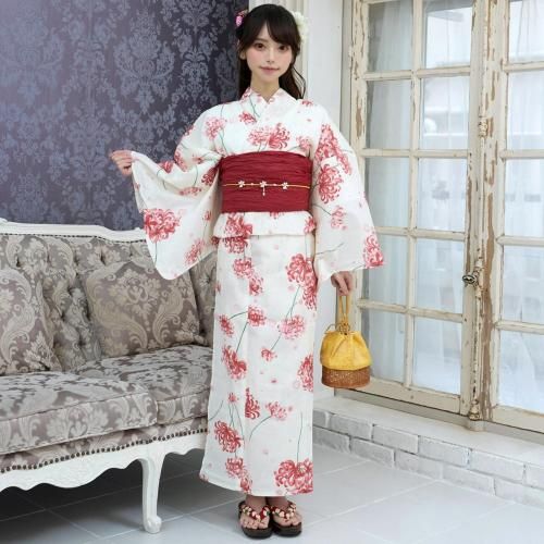 生成りに赤く淡い彼岸花が描かれた浴衣3点セット(YUKATA)。