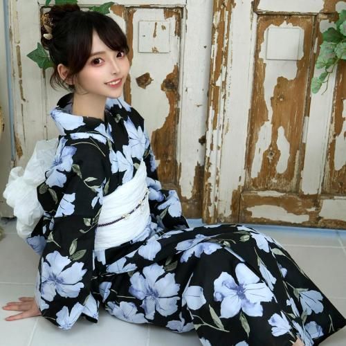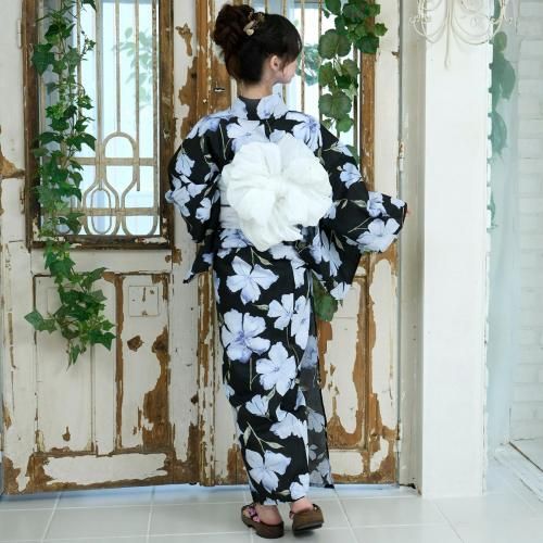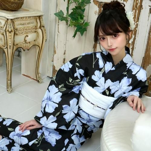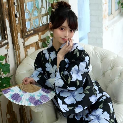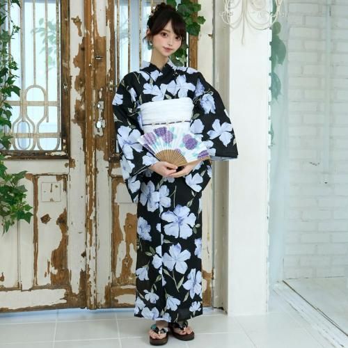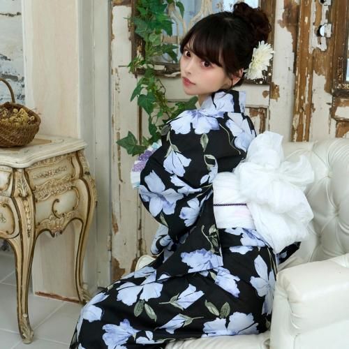 黒地に淡い藤色の花柄が幻想的な浴衣3点セット(YUKATA)