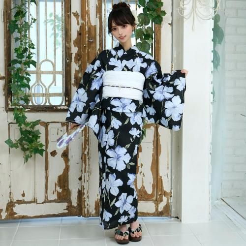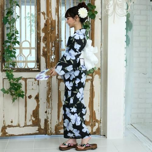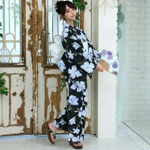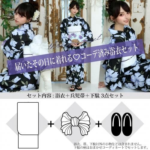 【クーポン利用で2,000円OFF!】黒地に淡い藤色の花柄が幻想的な浴衣3点セット(YUKATA)
