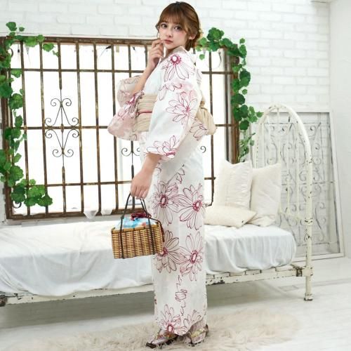 白地に愛らしい赤いマーガレット文様浴衣3点セット(YUKATA)。