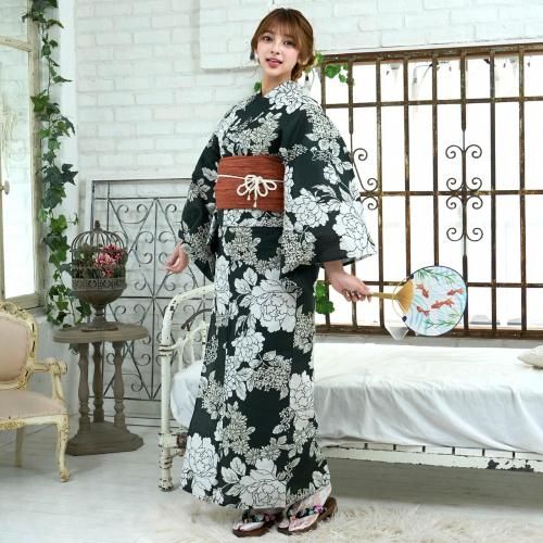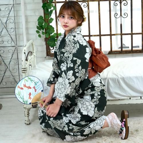 【ブラックフライデー★20%OFFセール】濃緑に多様な花が咲いたモダンな花柄浴衣3点セット(YUKATA)