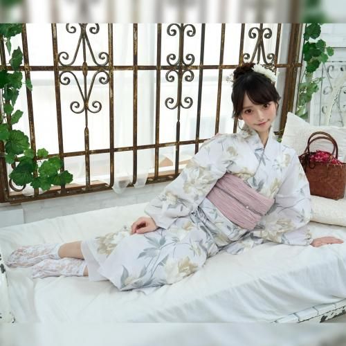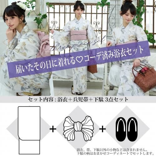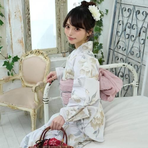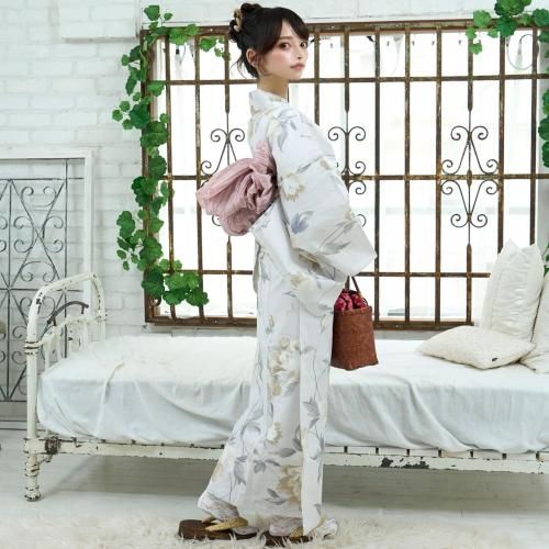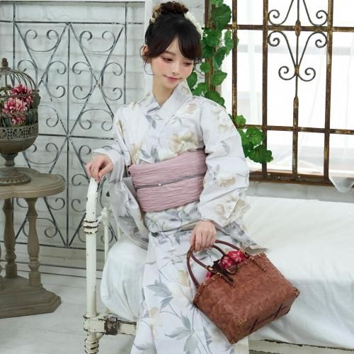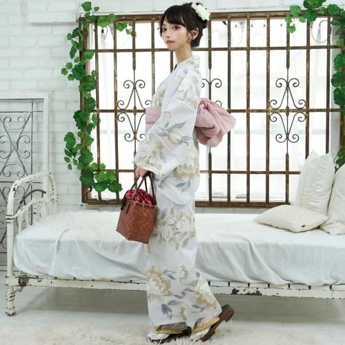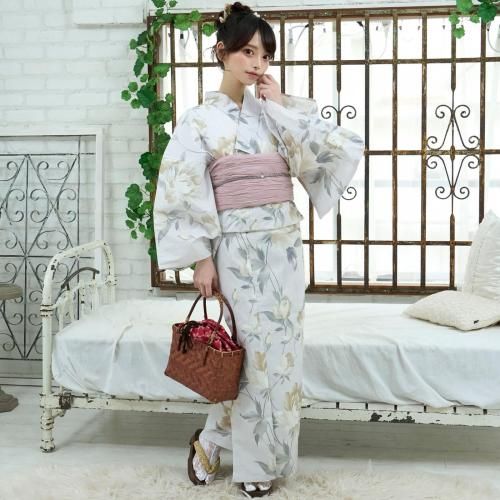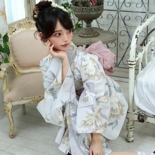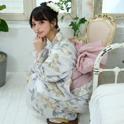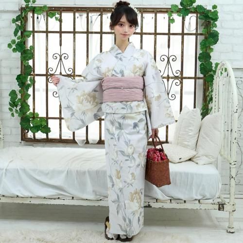 ライトグレーにクラシカルな牡丹文様の浴衣3点セット(YUKATA)。