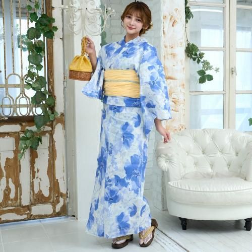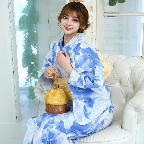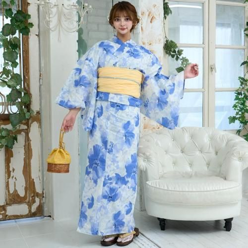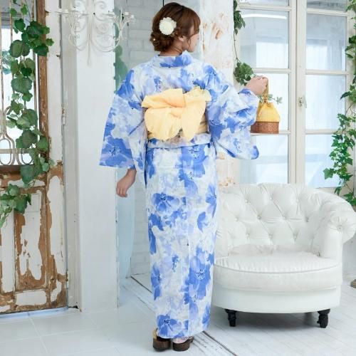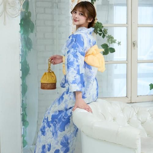 ブルーの濃淡が涼し気な花柄浴衣3点セット(YUKATA)。