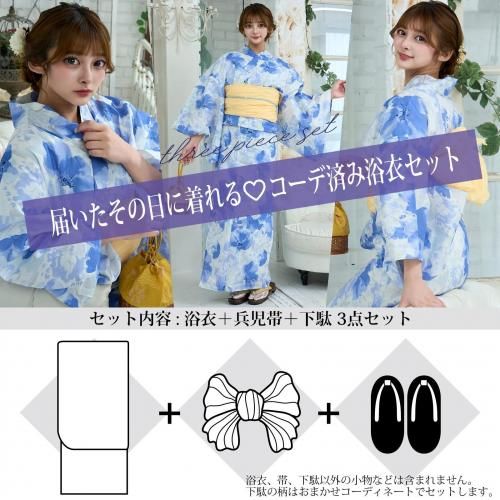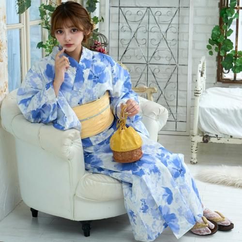 ブルーの濃淡が涼し気な花柄浴衣3点セット(YUKATA)