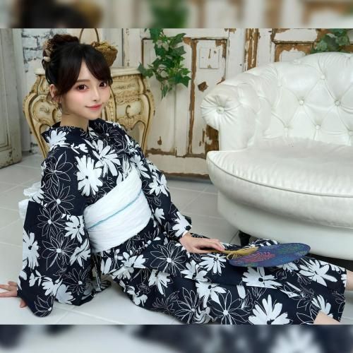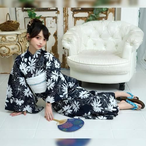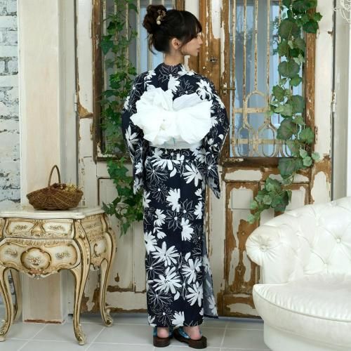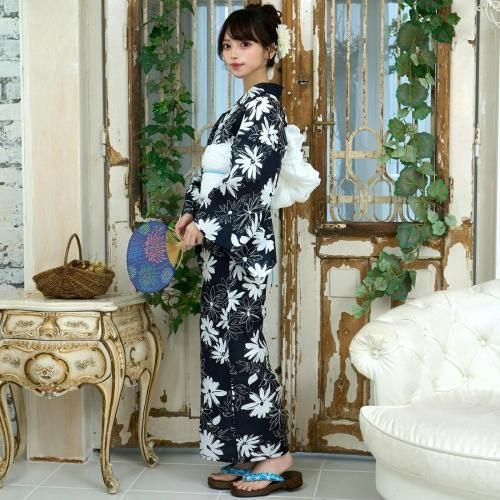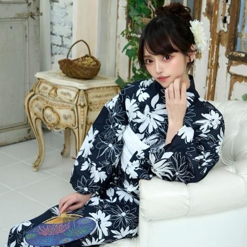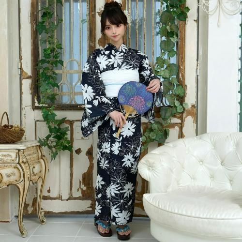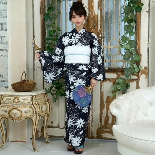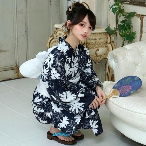 濃紺に可憐な白いマーガレットが咲き誇る浴衣3点セット(YUKATA)。