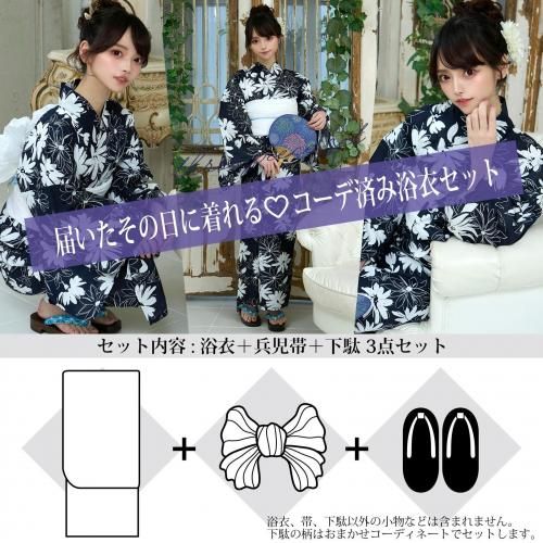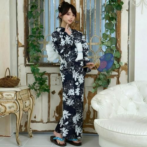 【クーポン利用で2,000円OFF!】濃紺に可憐な白いマーガレットが咲き誇る浴衣3点セット(YUKATA)