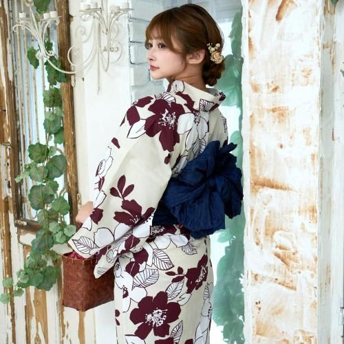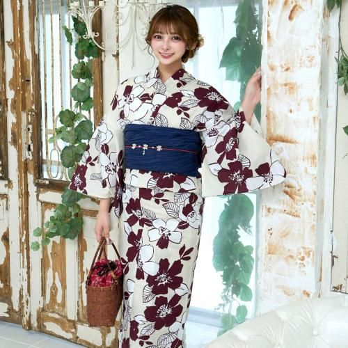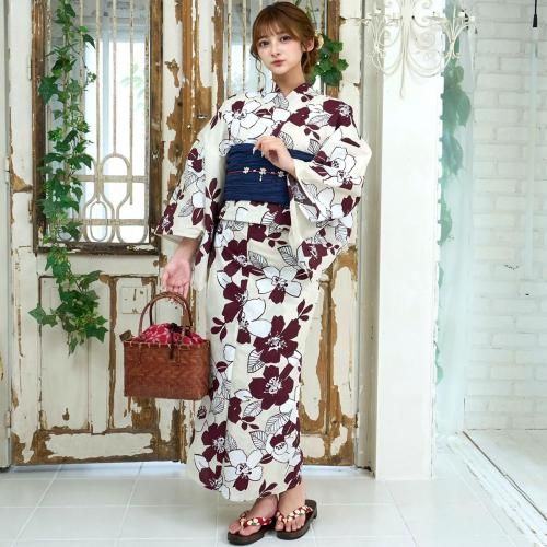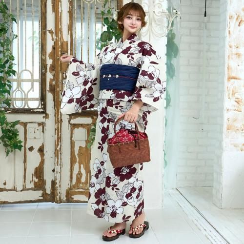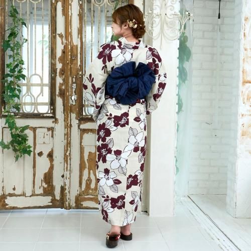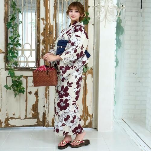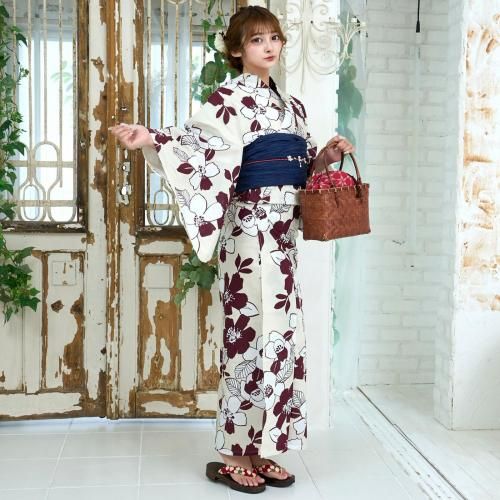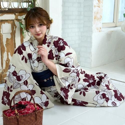 生成に赤茶と白抜き夏椿の浴衣3点セット(YUKATA)。