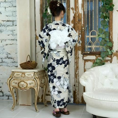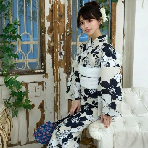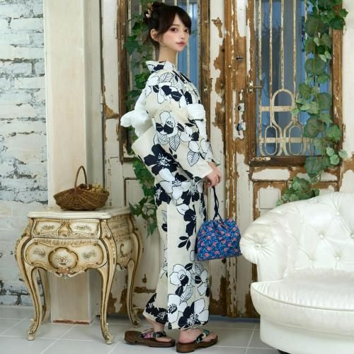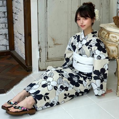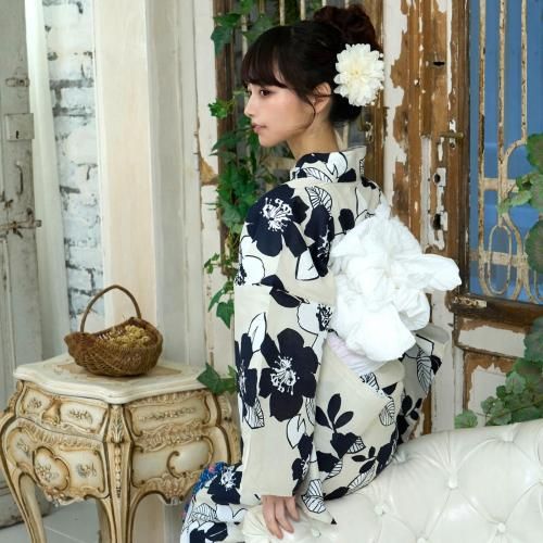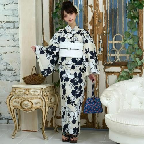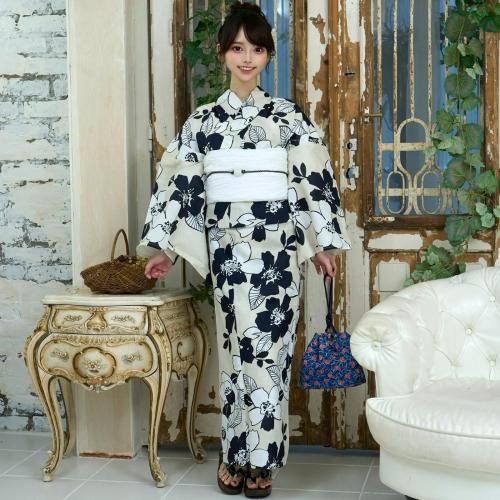 【クーポン利用で2,000円OFF!】生成に濃紺と白抜き夏椿の浴衣3点セット(YUKATA)