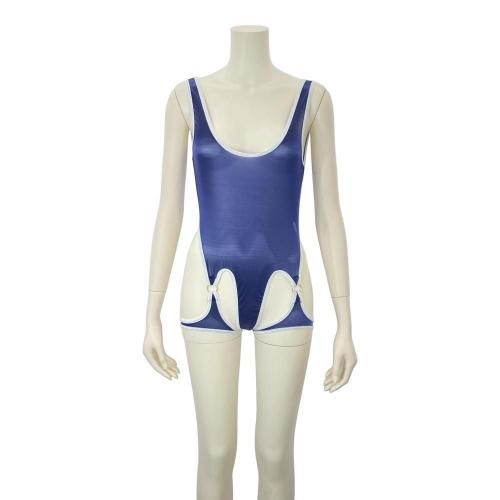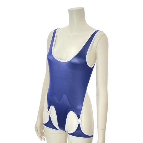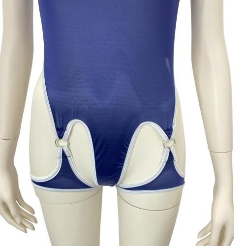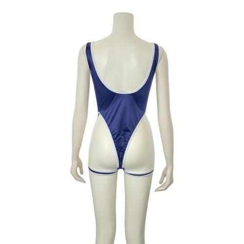 ガーターストラップが官能的なスク水風マイクロカットスイムウェア(SWIMWEAR)。ボディラインをなぞる指先が加速しそうな光沢ある滑らかな素材がスクール水着を彷彿とさせるスイムウェア。胸元を大胆に広げたUネックで谷間を魅せつけ、太ももやヒップが強調された超ハイレグにボディパーツが透けるほど薄手の素材が身体のラインを妖艶に魅せる。クロッチ部分は二列三段のホック付きでフィットしつつも着脱がしやすく、太ももにかけてリングで連結されたストラップが伸びガーターのような視覚効果がより刺激的な印象。大胆なデザインと透け感のある素材によって、身体のラインを最大限に引き立てたセクシーなデザインです。