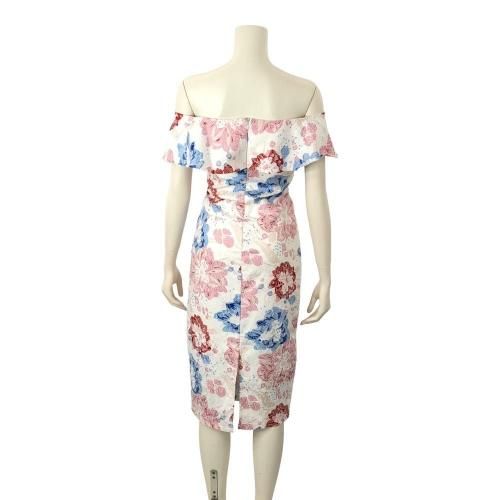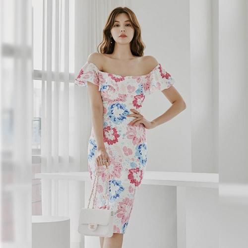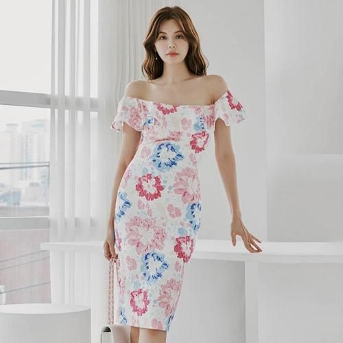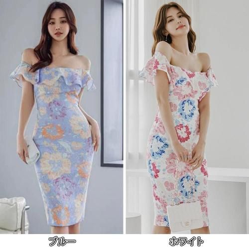 フラワープリントフリルオフショルダーワンピース(キャバドレス・CABARETDRESS)。淡いフラワープリントに女性らしいデコルテや肩を美しく魅せるオフショルワンピースは、肩口にあしらわれた軽やかなフリルが柔らかさと動きを加えることで、全体にフェミニンで華やかな印象を与えます。また、タイト目シルエットなのでミディ丈ながら重くならず、ウエストからヒップ、そして太ももにかけてのラインが美しく強調されセクシー。オフショルで柔らかなカラーデザインなので、控えめのアクセサリーやヘアアップスタイルとの相性も◎