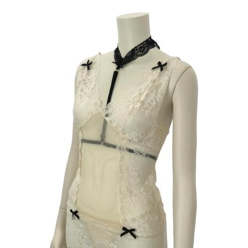 透け素材のドッキングがブランディングの美しさと妖艶なムードを作るベビードール(BABYDOLL)。レースとシアー素材の切り替えが細見えするマイクロミニのベビードールは、首元からアンダーバストへと繋がるハーネスが特徴的でデコルテラインを強調しセクシーな雰囲気を高めます。ボディの中央部は透け感のあるシアー素材が使われており、肌がほんのりと見えるデザインがより一層誘惑的な印象を与えます。オープンバックのバックシャンは腰のレースアップがウエストを引き締め、女性らしいボディラインを強調。肌を大きく見せつつも、レースアップのディテールが上品さやエレガントさを保ち、洗練されたセクシーさを表現できます。