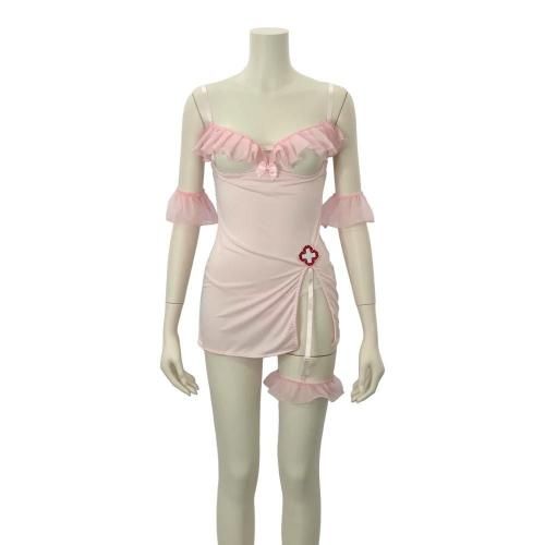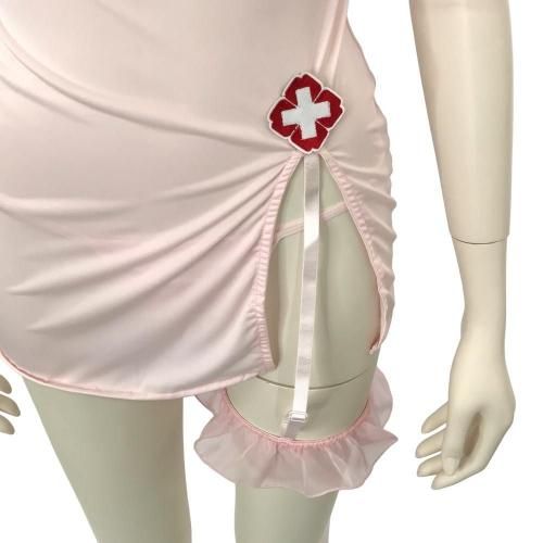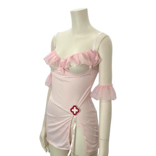 抑制された願望を思いっきり放出させるナース風コスプレ(COSPLAY)。甘いピンクのカラーに、バストにかかるフリルが柔らかでフェミニンなタイトシルエットのナースコス。大胆にカッティングされたオープンバストのフリルからはバストトップがチラ見えし、ウエストから入った深いスリットは脚のラインを美しく魅せ、ガーターリングがさらにフェティシズムを刺激します。ツルンとボディにフィットする素材がウエストからヒップにかけて滑らかな曲線を際立たせ、日常では味わえないハレンチナースの腰つきに理性が崩壊してしまいそう♪