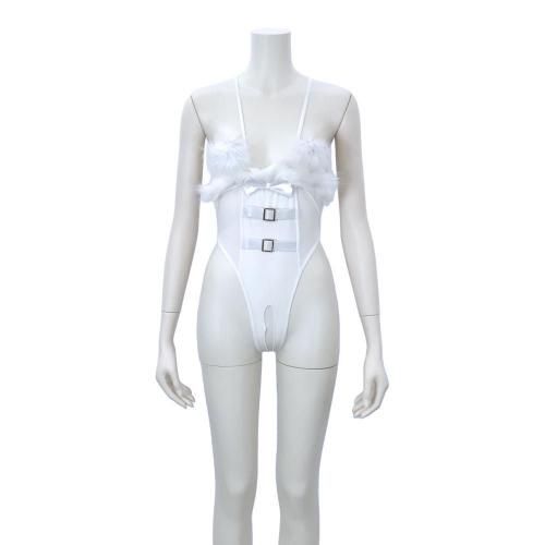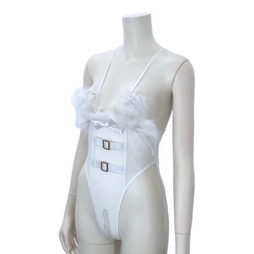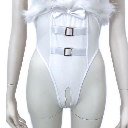 純粋無垢な純白イメージを大胆な露出で裏切るバニーガール風コスプレ(COSPLAY)。バストを大胆にも開放したテディはベロア調の光沢に透け感のあるシアー素材を使用し、ポイントにゴールドベルトとファーをあしらったコルセットデザイン。超ハイレグがぐいぐいとクロッチへ食い込み、ヒップまで大胆に開いたオープンクロッチが可愛らしいバニーに恥辱を与えます。オープンバストにはファーの二プレスが華やかにトップを隠し、さらに可愛くセクシーにパートナーを濃密時間へ誘います。