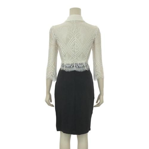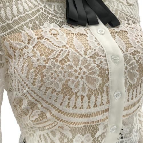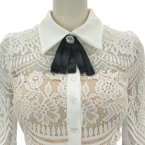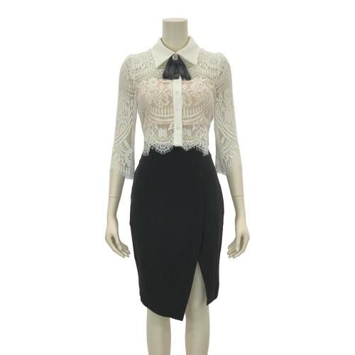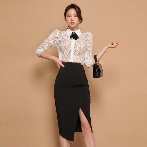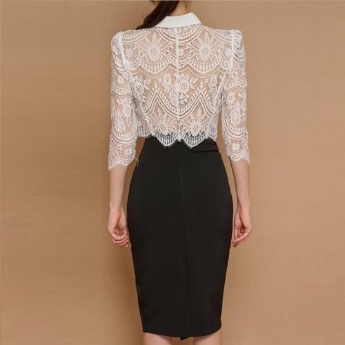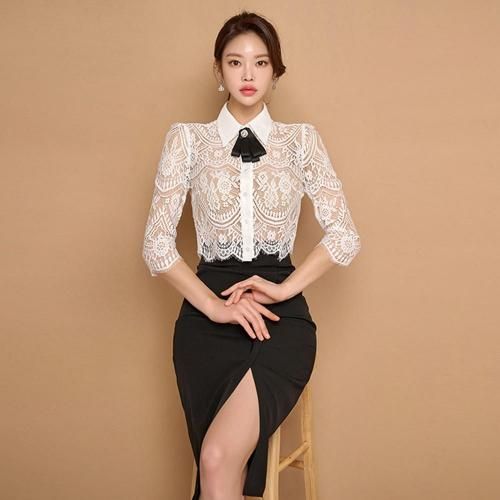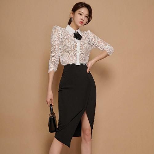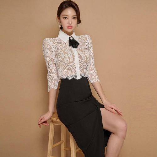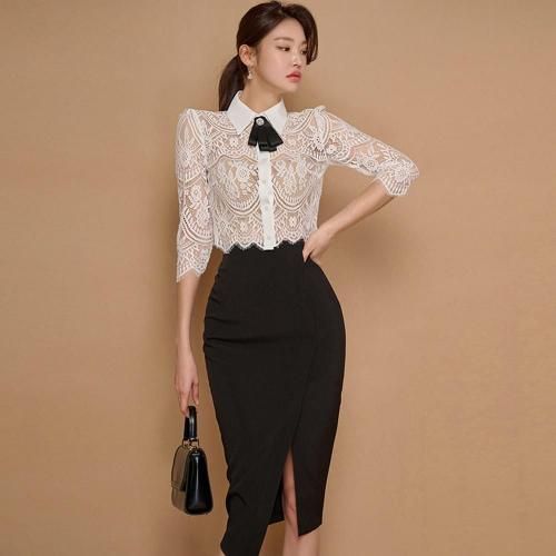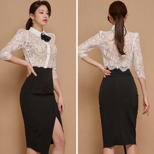 バックシースルートップス×Iラインスリットスカートセットアップ(キャバドレス・CABARETDRESS)。繊細なレースのトップスと、スマートなブラックのタイトスカートが織りなす洗練されたセットアップは、フェミニンさとシャープさが絶妙に融合。バックスタイルの透けた素肌がセクシーなショート丈トップスがスカートとのバランスが良く、白い襟が全体の甘さを引き締め知的な雰囲気をプラス。襟元には着脱可能なリボンブローチが顔周りを華やかに演出します。アイラッシュレースの七分袖は手首をほっそりと見せる効果があり、レースの透け感が腕を美しく彩ります。スカートはボディラインに沿うIラインのタイトシルエットが女性らしい曲線美を際立たせ、スリットが歩くたびに脚がのぞき、デザイン性だけでなく足さばきの良さも兼ね備えています。