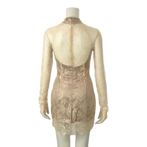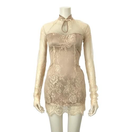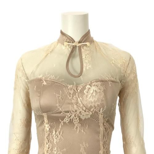 バックレースチャイナ風ミニワンピース(キャバドレス・CABARETDRESS)。繊細なアイラッシュレースが全体を覆うデザインは、上品さとセンシュアルな雰囲気を両立。特に、腕と背中はレースから肌が美しく透けることで、大胆な魅力を放ちます。ボディラインに沿うようにカッティングされたサテンの裏地は、滑らかな肌触りと光沢感で女性らしいしなやかなシルエットを演出。胸元にはパットが内蔵されているため一枚で美しいバストラインをキープし、チャイナ風の立ち襟とキーホールカットが、首元をすっきりシャープに見せてくれます。洗練されたディテールが周りの視線を集め、全体のスタイルを格上げします。