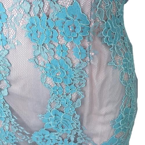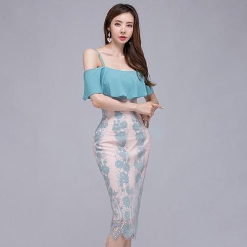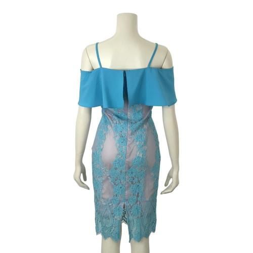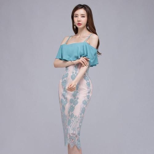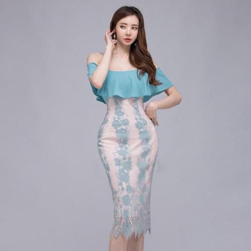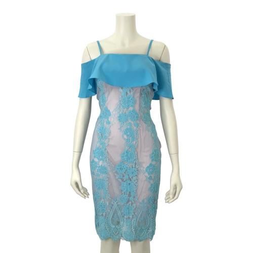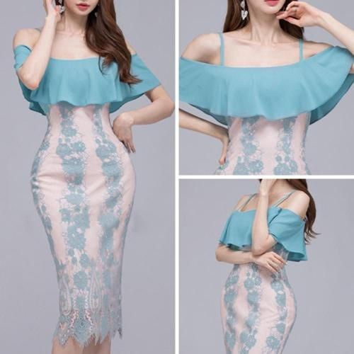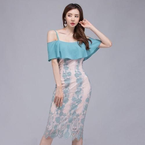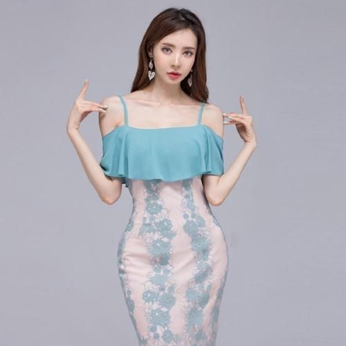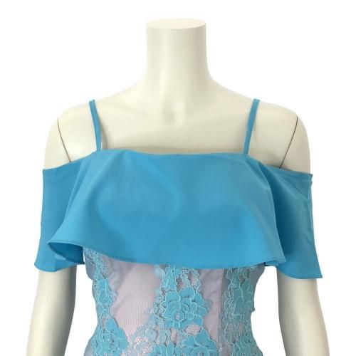 オフショルダービッグフリル レースワンピース(キャバドレス・CABARETDRESS)。明るく涼しげな淡いブルーが目を惹くワンピは、ストラップ付きのオフショルダーデザインがデコルテと肩周りを美しく見せ、大きなフリルが女性らしい華やかさをプラス。また、ストラップが付いているため安定感があり、安心して着用できます。ブルーの刺繍レースの裏地にはフェミニンで優しげな淡いピンクの裏地を使用し、全体のデザインがより立体的で華やかな印象に。丈は膝下丈で、上品で落ち着いた大人の雰囲気を演出しています。結婚式のお呼ばれやパーティーシーンはもちろんのこと、ディナーやコンサートなど特別な日を彩る一着として活躍してくれます♪