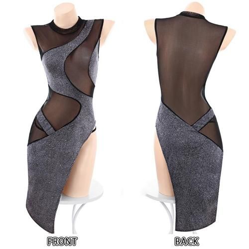 ラメの輝きと透けた素肌が艶やかな曲線を描くボディコン風コスプレ(COSPLAY)。煌びやかなシルバーラメとスケスケなメッシュ素材のドレスは、シースルー部分と光沢部分の境界線が流れるような曲線で、身体のラインに沿ってデザインされ女性らしい曲線美を強調。腰から入った深いスリットからはチェーンストーンのガーターストラップがラグジュアリー感漂い、太ももから足にかけてのラインを官能的に。また、背中のラインが美しく浮かぶ透け感が妖艶なバックスタイルも堪らない魅力です。付属のサテングローブはひんやり滑らかな触覚が触れる者をゾクゾクさせ、フェティシズムを?き立てます。