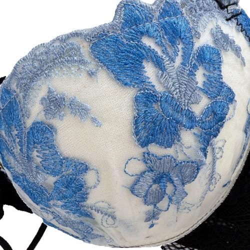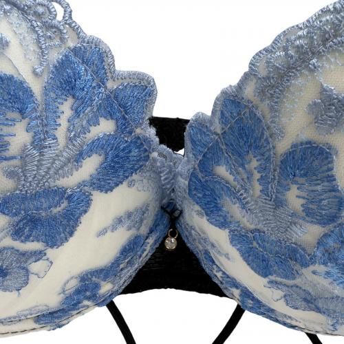 フローラルシャワー クロスストラップ ブラ・ショーツセット(ブラセット)。清楚なホワイトベースにワントーンの花柄刺しゅうがエレガント。バストを下からすくい上げるように支えるU字ワイヤー入りで、しっかりホールドしながらも内蔵されたふんわりパットで自然なボディメイクが叶います。ショーツは透け感がセクシーな人気の高いオールバックレース仕様。ブラとショーツそれぞれにクロスされた細いストリングがスタイリッシュなアクセントになり、ロマンチックでエレガントな雰囲気を持ちながら現代的なスタイルを取り入れたデザインです。