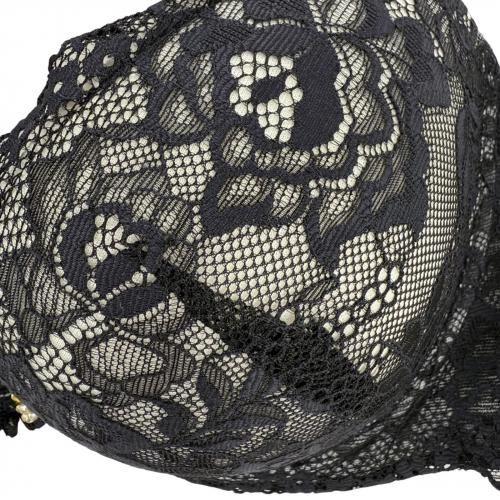 リュクスな総レース脇高&L字ワイヤー美谷間メイクブラ・ショーツセット(ブラセット)。V字にカットされたブラジャーが胸元を美しく見せ、全体のレースが白い裏地と重なることで繊細な柄が際立つシックなデザイン。一般的なU字型のワイヤーと異なり中心部分のワイヤーが繋がっていないL字型ワイヤーを使用。前中心のワイヤーが肌に食い込む不快感を軽減しつつバストをサイドから中央にしっかり寄せ、またパットが内蔵され自然な谷間を作り出す効果があります。脇に流れてしまいがちなバストの肉をしっかり集めてカップに収める脇高構造が横流れを防ぎ、すっきりとしたシルエットを保つ効果が期待できます。