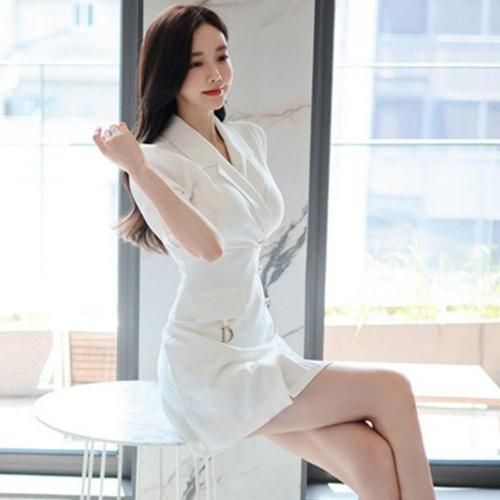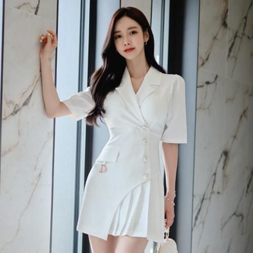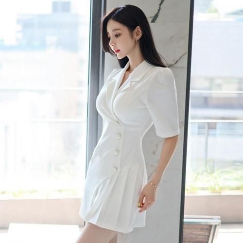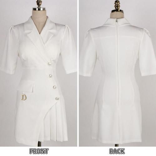 アシンメトリーテーラードプリーツワンピース(キャバドレス・CABARETDRESS)。きちんと感と女性らしさを兼ね備えた純白ワンピースは、テーラードカラーとプリーツのアクセントが目を惹くデザイン。テーラードのVネックが顔周りをすっきりと見せ、知的でシャープな反面、パフスリーブが柔らかな女性らしさをプラス。また、アシンメトリーなヘムラインとプリーツが歩くたびに優雅に揺れ動きます。ハイウエスト部分にはクラシカルなダブルボタンを配置し、視覚的にウエストラインを細く見せる効果も期待♪遊び心のあるデザインを加えることで、一歩先のおしゃれを楽しめます。