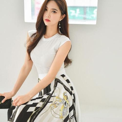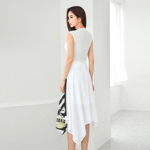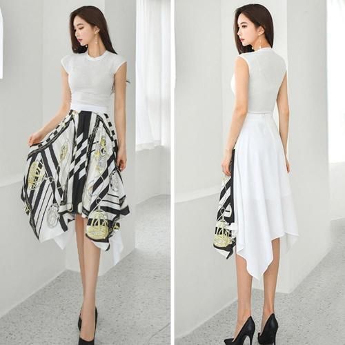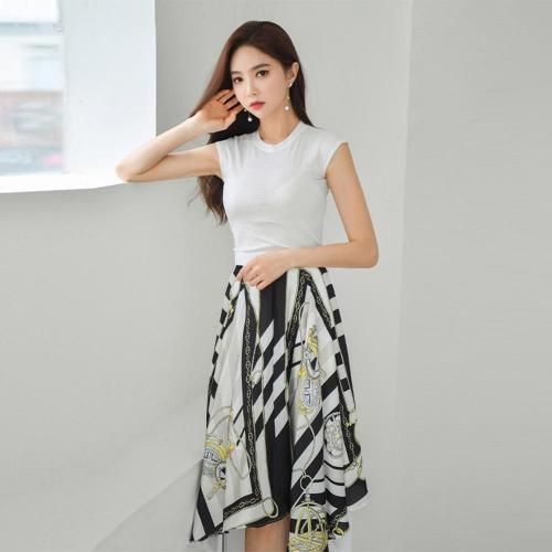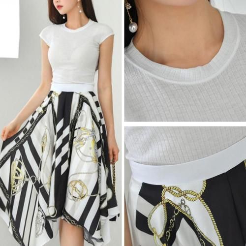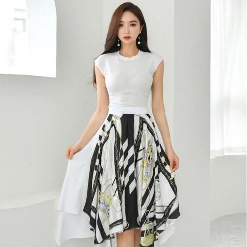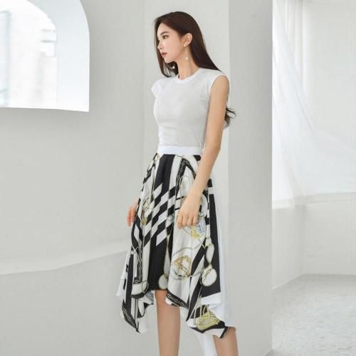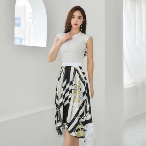 2WAYスタイル 前後切替スカートアシメセットアップ(キャバドレス・CABARETDRESS)。伸縮性のあるリブ素材のハイネックトップスは、フレンチスリーブのように袖が短く肩のラインをきれいに見せます。スカート前面は黒と白のモノトーンに、黄色がかったゴールドの柄がアクセントになっているスカーフ柄と、後ろの白無地で大きくデザインが異なり、見る角度によって表情が変わるのも魅力。シンプルなトップスに、個性的で目を引くスカートを合わせることで、バランスの取れたコーディネートになっています。また、裾の長さが不揃いなアシンメトリーヘムで、歩くたびに揺れて軽やかな印象を与えます。オフィスはもちろん、少しドレッシーなレストランでの食事やパーティーにも活躍しそうなエレガントなスタイルです。