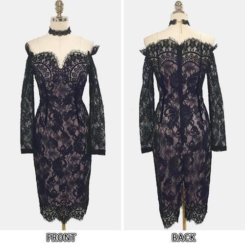 【只今セール中】スカラップブラックレースオフショルダー長袖ワンピース(キャバドレス・CABARETDRESS)