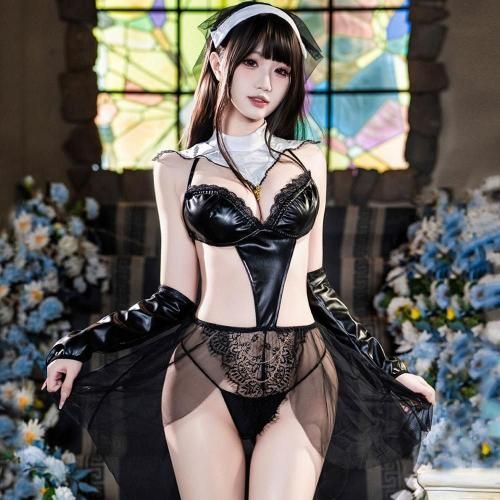 柔らかなヒップの美しいラインが透ける強くて繊細なシスター風セクシーコスプレ(SEXYCOSPLAY)。ブラックにホワイトのアクセントが清楚感際立つシスターコスプレ。トップスは、光沢のあるレザー調生地の胸元が大きく開いたビスチェ風デザインに、Vネックにはレースのトリミングが施され女性らしさと華やかさをプラス。ショーツ一体のスカートは、黒いレースとシースルーの生地から柔らかなヒップの丸みが淡く浮かび上がる。アームカバーを身に着けることで全体的な統一感とセクシーさを高め、十字架の付いたチョーカーでシスターらしさがさらにアップ。神聖なイメージのシスター衣装を乱すことで甘美な背徳感が胸に広がる♪