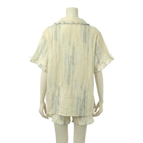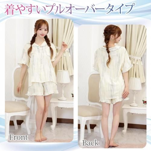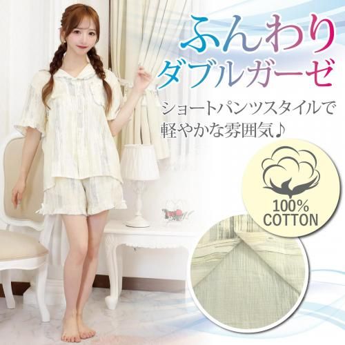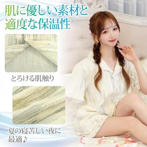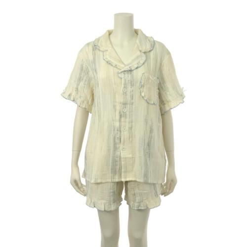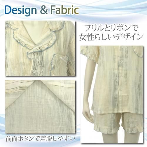 柔らかなカラーが涼し気なフリルのパジャマ(PAJAMA)。空気を含んだふんわりダブルガーゼの風合いが寝苦しい夜を快適にし、柔らかなカラーにショートパンツスタイルがさらに軽やかな雰囲気。肌に優しい素材と適度な保温性がリラックスタイムをより支えてくれます。パンツは実用的なポケット付きでトップスは前面ボタンで着脱しやすく,ポイントリボンとフリルが女性らしいデザインです。