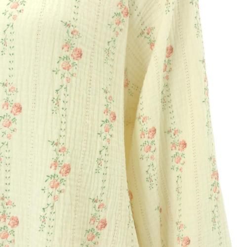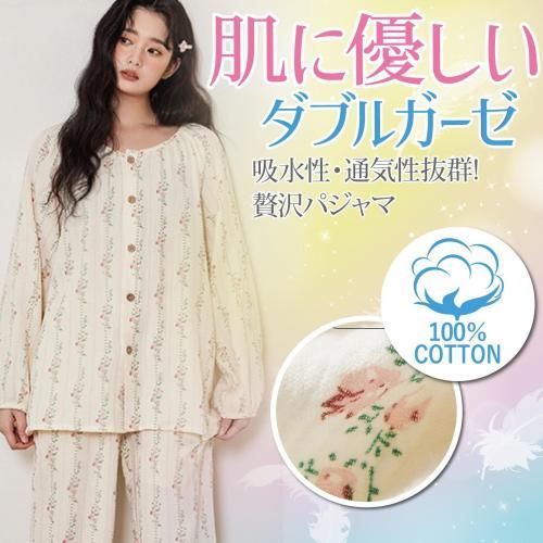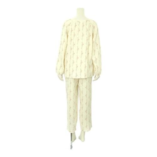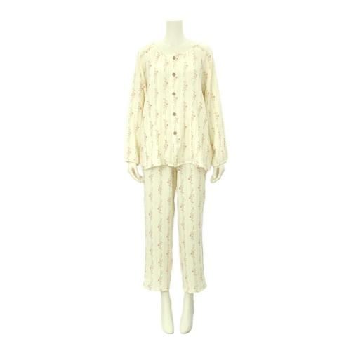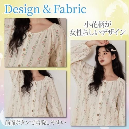 小花柄ラウンドネックロングスリーブパジャマ(PAJAMA)。落ち着いたアイボリーカラーにピンクの小花柄ラインがガーリーで、年齢を問わず着用いただけるデザイン。ラウンドネックで肌の露出が少なく、袖や裾にゴムを使用していないので締め付けもなく快適に過ごせます。保湿性や吸収性に優れているので、季節を問わずロングシーズン着用いただけます♪