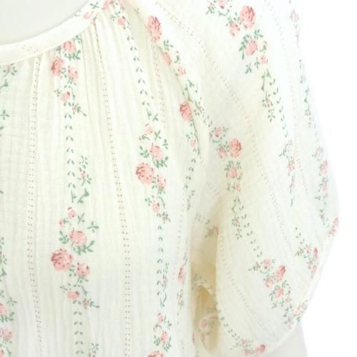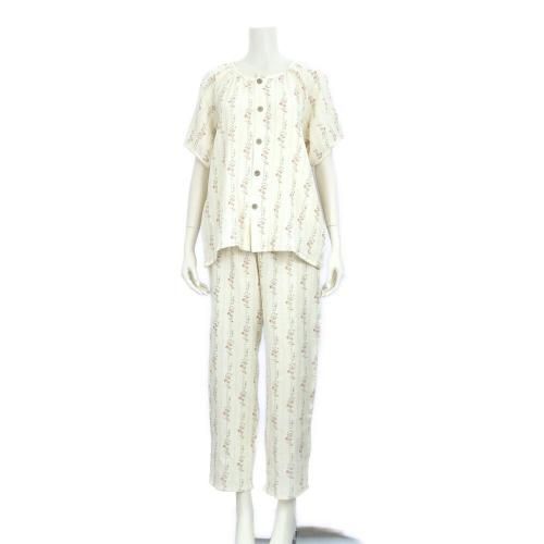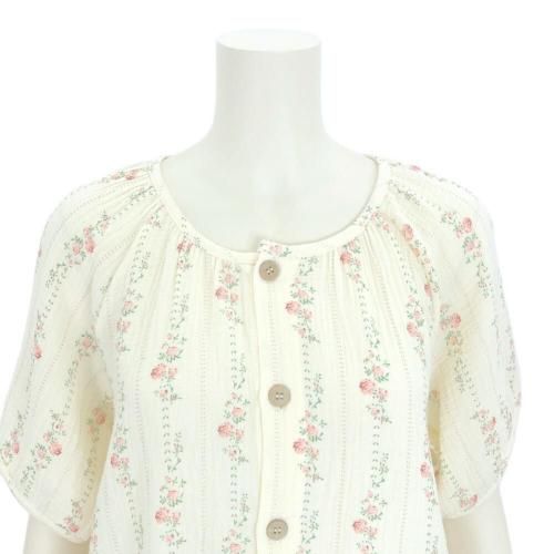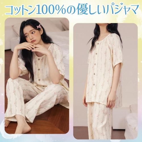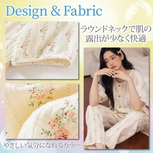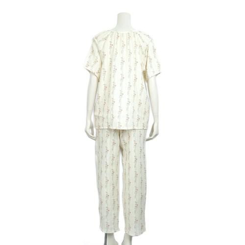 小花柄ラウンドネック半袖パジャマ(PAJAMA)。アイボリーカラーにピンクの小花柄ラインがガーリーなデザイン。ラウンドネックで肌の露出が少なく、ロングパンツなのでリラックス時にもインナーが見えず快適で安心なお家時間を過ごせます。保湿性や吸収性に優れているので、季節を問わずロングシーズン着用いただけます♪