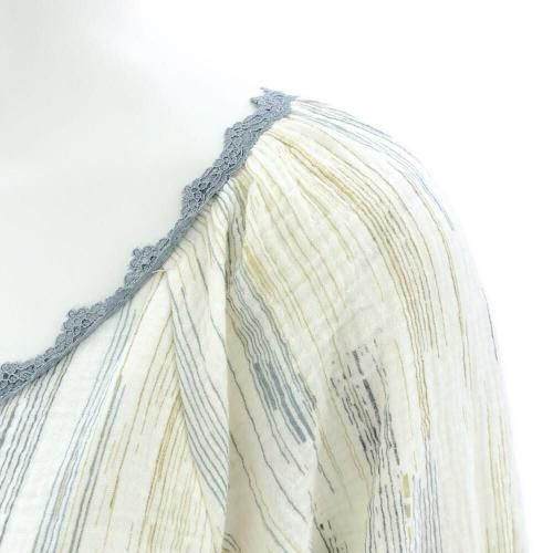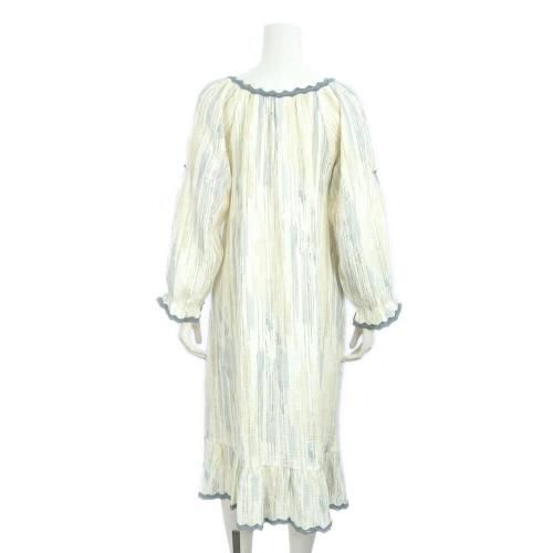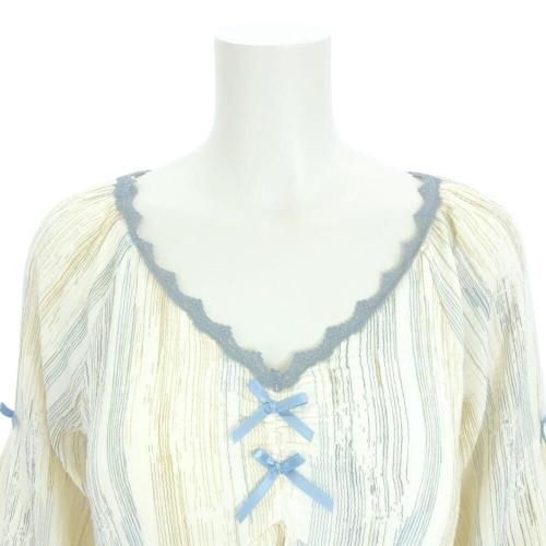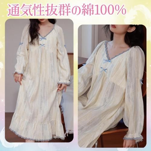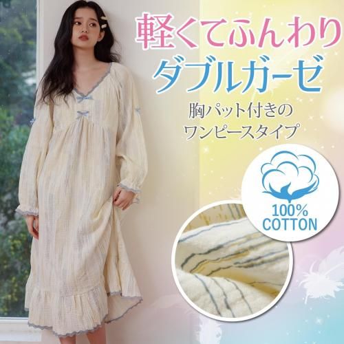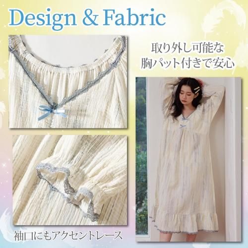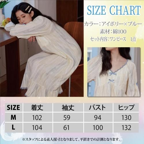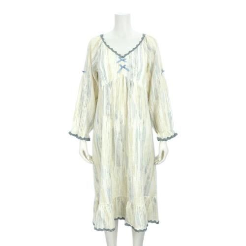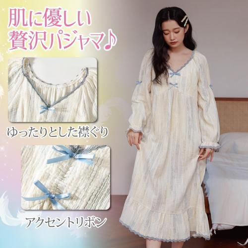 ランダムペンシルストライプ長袖ワンピースパジャマ(PAJAMA)。くすみブルーのレースで縁取りされたクラシカルなワンピースはロング丈が体形カバーし、ブルー×イエローのランダムペンシルストライプに小さなブルーのリボンがポイント♪取り外し可能な胸パット付きなのでリラックスタイムにピッタリです。通気性や吸収性に優れているので、寝汗をかいてもサラッと快適です。