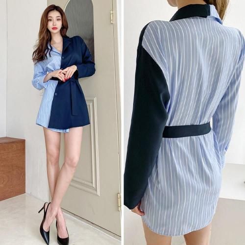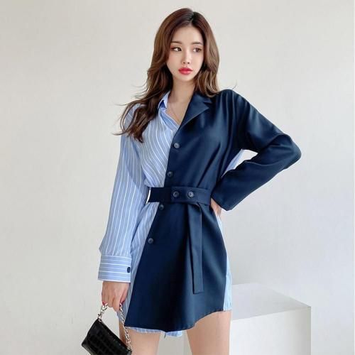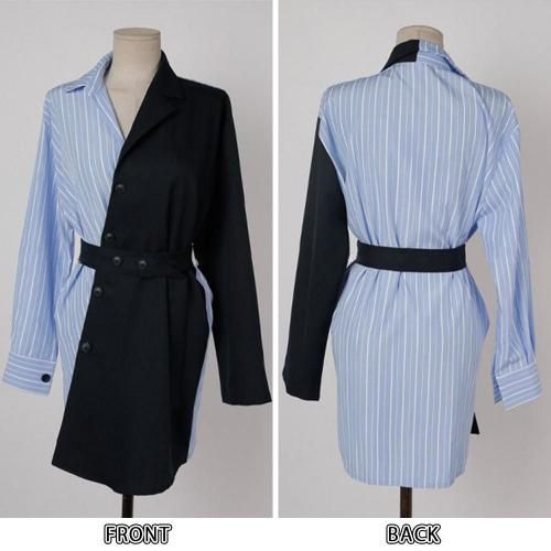 エッジの効いたアシメドッキングシャツワンピース(キャバドレス・CABARETDRESS)。アシンメトリーがモードでスタイリッシュなシャツワンピースはVネックが顔周りをすっきりと見せ、ストライプ柄のカジュアルな印象とネイビーの深みがジャケットのようなシャープな印象のドッキングデザイン。全体的にゆったりとしたオーバーサイズのシルエットですが、ボタン付きベルトでウエストマークすることでメリハリのあるスタイルが完成。ミニ丈なのでヒールやブーツと合わせて軽快でセクシーな着こなしや、ボトムスと合わせてフロントオープンにしても存在感を放ちます。重ね着次第でロングシーズン着まわせる万能アイテムです♪