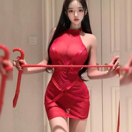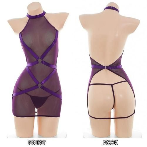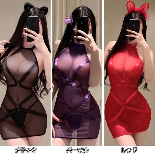背中から伝わる欲望に理性が壊れるバックレスベビードール(BABYDOLL)。肌を繊細に透かしたメッシュ素材に、サテンのクロスが拘束感を漂わせる大胆でミステリアスな色気漂うベビードール。首元のホルターネックからストレッチ性のあるメッシュ素材がボディにしなやかにフィットし、クロスに配置されたサテン地のハーネス風ストラップがボディラインを美しく引き締め、Oリングがアクセントとなりより大胆でモダンな印象。背中はバックレスの挑発的な姿に思わず息を呑むセンシュアルデザインで、情熱的で忘れられない特別な夜を演出。