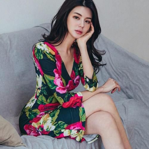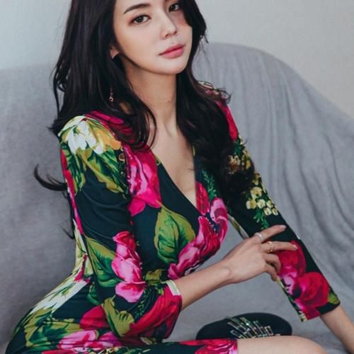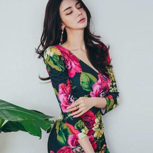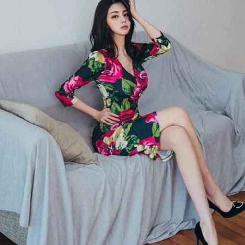 カシュクールフローラルプリントワンピース(キャバドレス・CABARETDRESS)。黒いキャンバスに描かれた大輪の花々が絵画のようにドラマティックで、間接照明が灯す ムーディーな明るさの中でも華やかに映える大人の女性のためのエレガントな一着。カシュクールに伸縮性のあるタイトなシルエットが優雅な曲線美を完成させ、夜の光の中で誰もが振り返る存在感を放ちます。また、斜めラインのスリットが歩くたびに脚のラインを美しく見せ視線を誘導し、縦のラインを強調するためスタイルアップ効果や着痩せ効果が期待。ワンピース自体が主役となるため、小物は黒のクラッチバッグやシンプルなパンプスなど、控えめなものを合わせるのがおすすめです♪