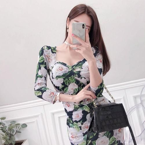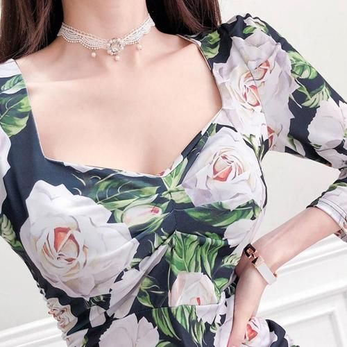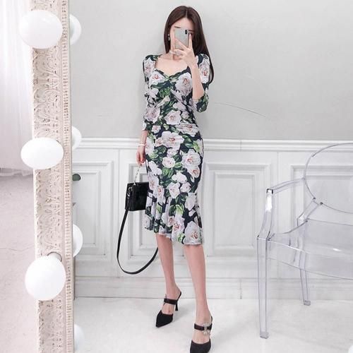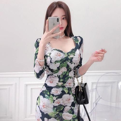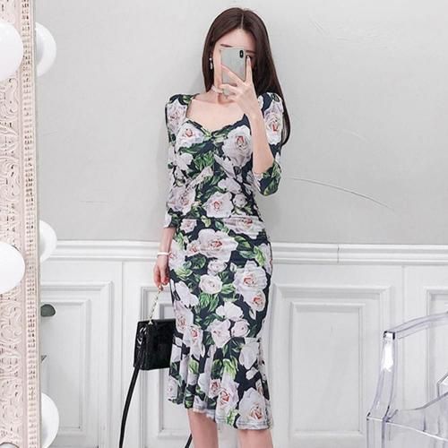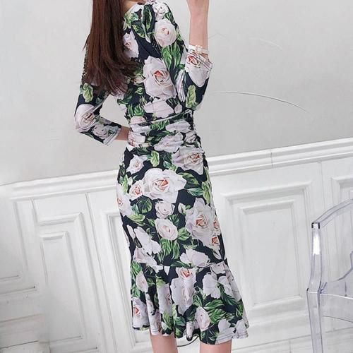 ローズプリントマーメイドタイトフィットワンピース(キャバドレス・CABARETDRESS)。ネイビー地に大きなローズ柄が映えるこのワンピースは華やかさとシックな印象を与え、伸縮性のある素材がボディラインに美しくフィットし、タイトシルエットながらも快適な着心地を実現。ウエストからヒップにはサイドギャザーが施され、気になる部分をカモフラージュしながらボディラインを立体的に見せ、スタイルアップ効果を発揮します。裾はフリル状に広がるマーメイドシルエットとなっており、歩くたびに優雅な動きを演出し、女性らしい優美さを引き立てます。