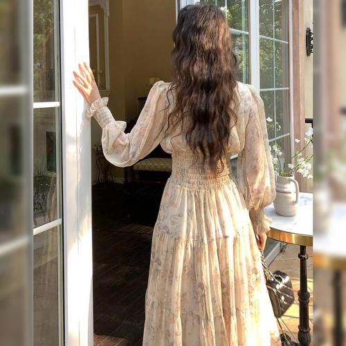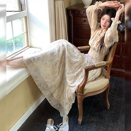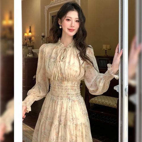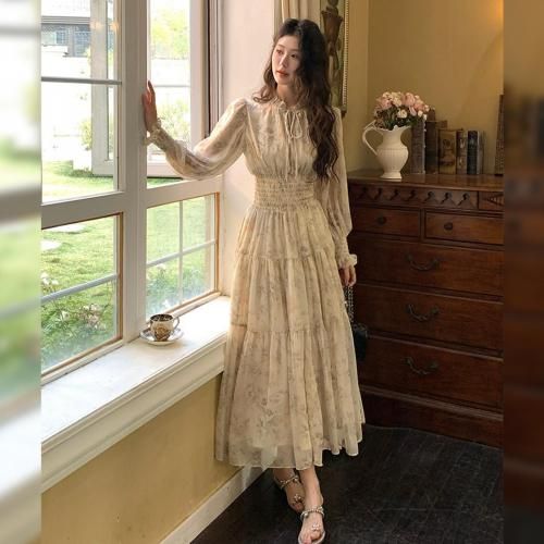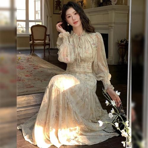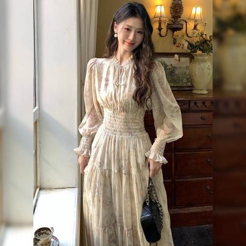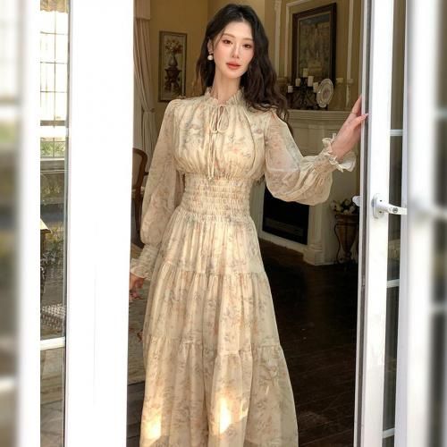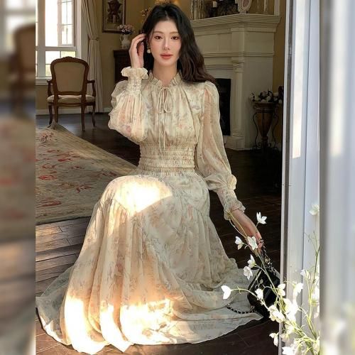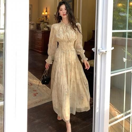 クラシックシフォン花柄ロングワンピース(キャバドレス・CABARETDRESS)。繊細な透け感のある素材と、ロマンチックなディテールがクラシックで優雅な雰囲気を醸し出すスタンドカラーのロングワンピース。柔らかなイエローに淡い花柄の控えめな色調に、シフォンのふんわり感が派手すぎずクラシックな印象を与えます。ウエスト部分には細かく寄せられたシャーリングが施されウエストをきゅっと引き締めて見せながら、上下のふんわりとしたボリュームとの対比でスタイルアップ効果を生み出します。袖口にはフリルがあしらわれ、手元までエレガントな仕上がりに。クラシックでロマンチックな雰囲気を楽しみたいシーンに最適な一着です。