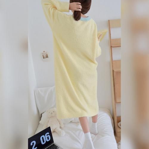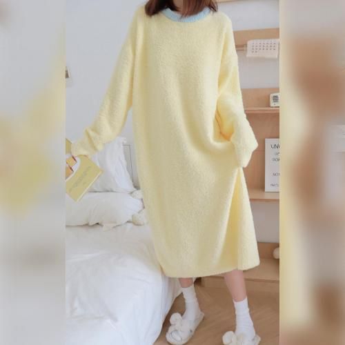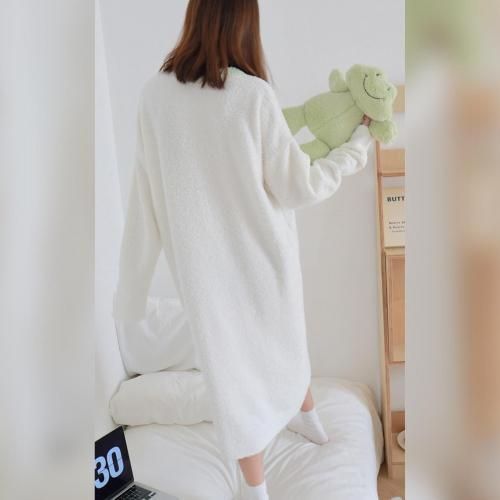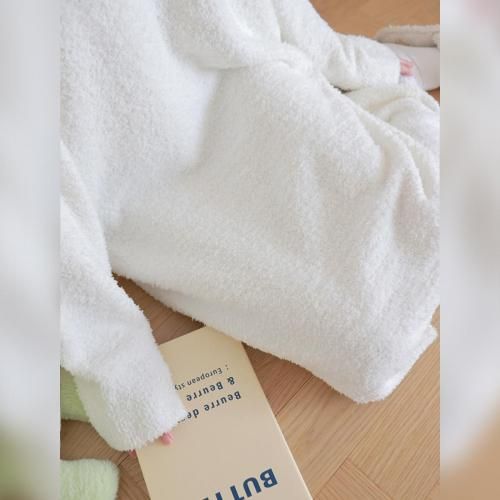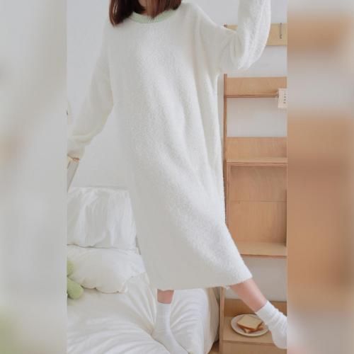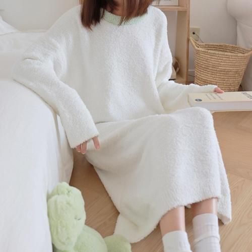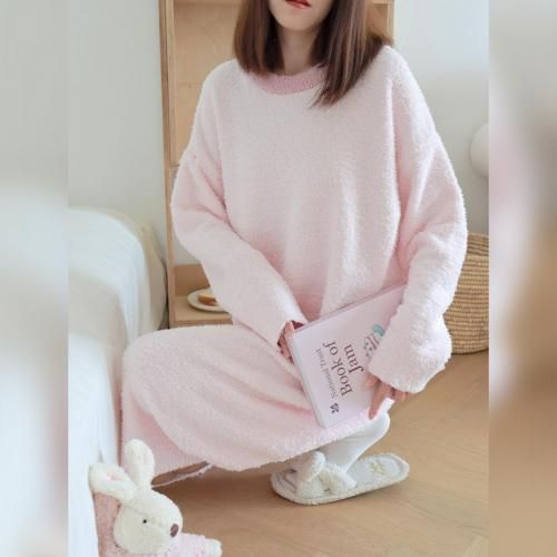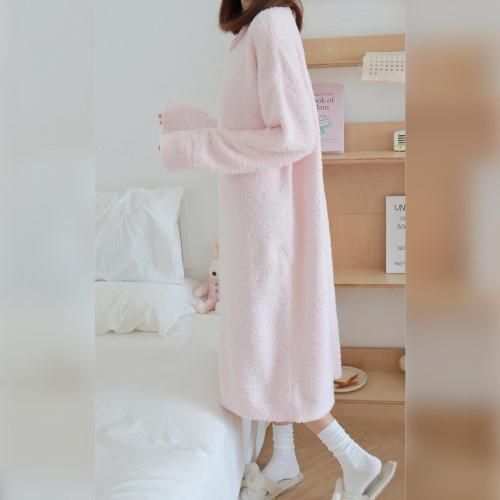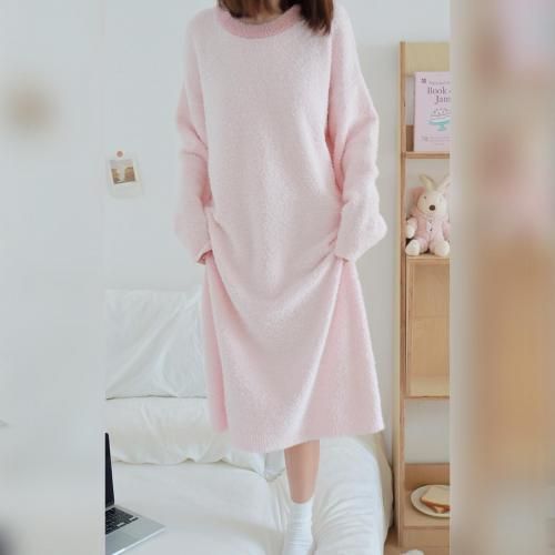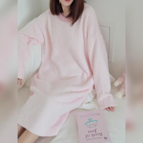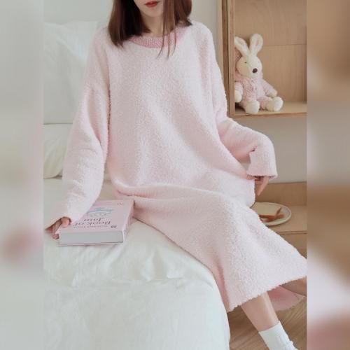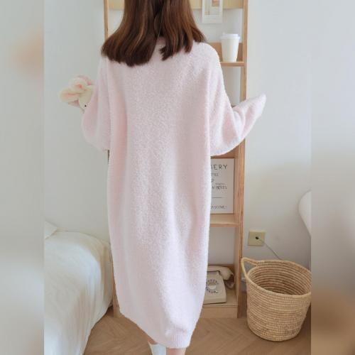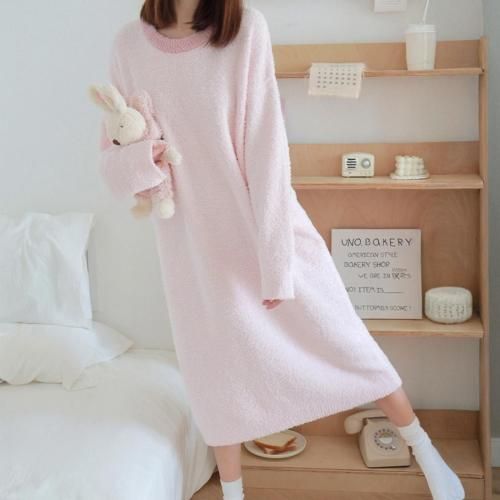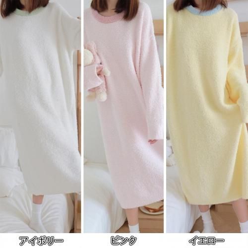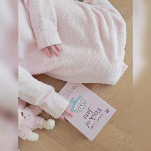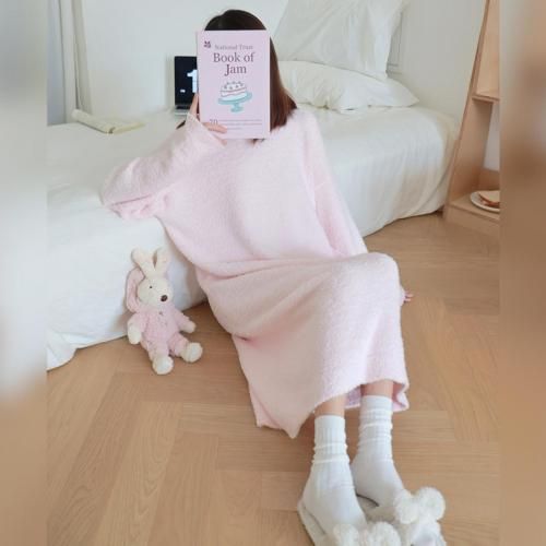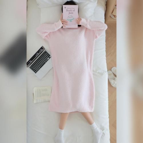 さっと着られる手軽さがリラックスタイムにぴったりなルームウェア(ROOMWEAR)。全身を優しく包み込むようなゆったりとしたオーバーサイズのロング丈ワンピースは、身体のラインを拾いにくく、1枚でさっと着られる手軽さがリラックスタイムにピッタリ。ベビーピンクが優しくフェミニンな印象を与え、まるで毛布に包まれているようなふわふわで肌触りの良い素材が、抜群の着心地と暖かさを叶えます。寒い季節の部屋着として心地よさと可愛らしさを両立させた、おうち時間を豊かに彩るアイテムです。