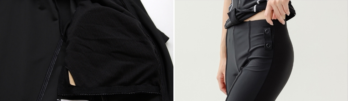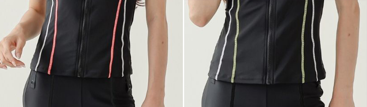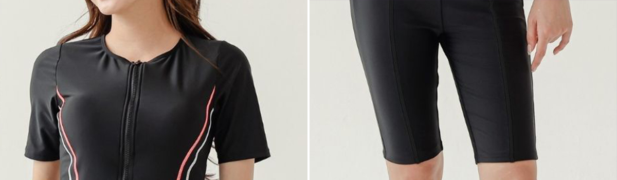 ウエスト部分に施された2本のラインがスタイルを際立たせ、フロントジップで着脱も簡単。ビーチやプールサイドでの運動やリラックスタイムに最適です。
