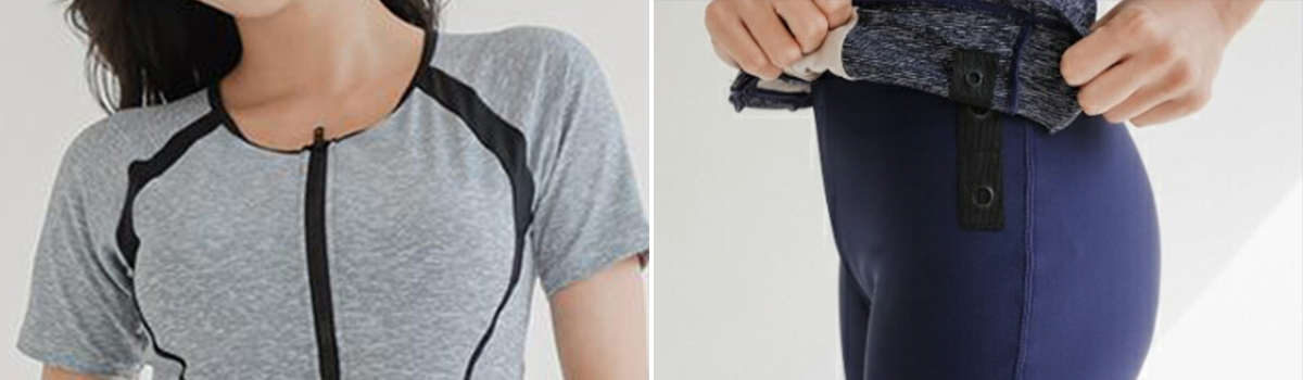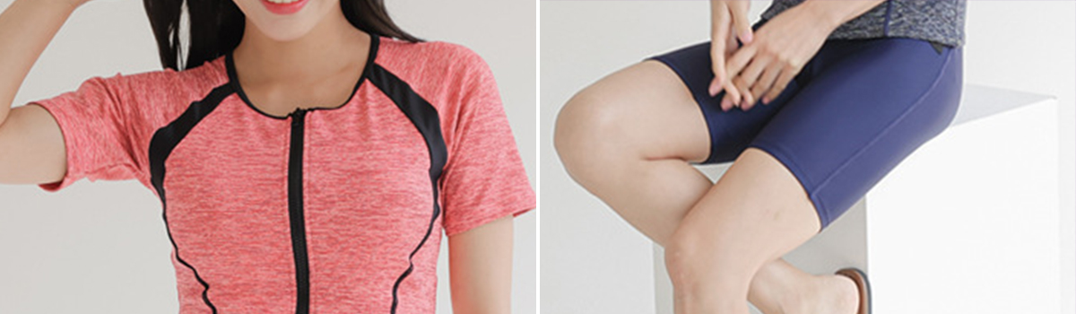 深めの股上とめくれ防止スナップボタンがついているので、どんな運動も安心して楽しめます。さらに、フロントジップと半袖デザインで、着脱もラクラク♪すっきりとしたラインが女性らしさを引き立てます。