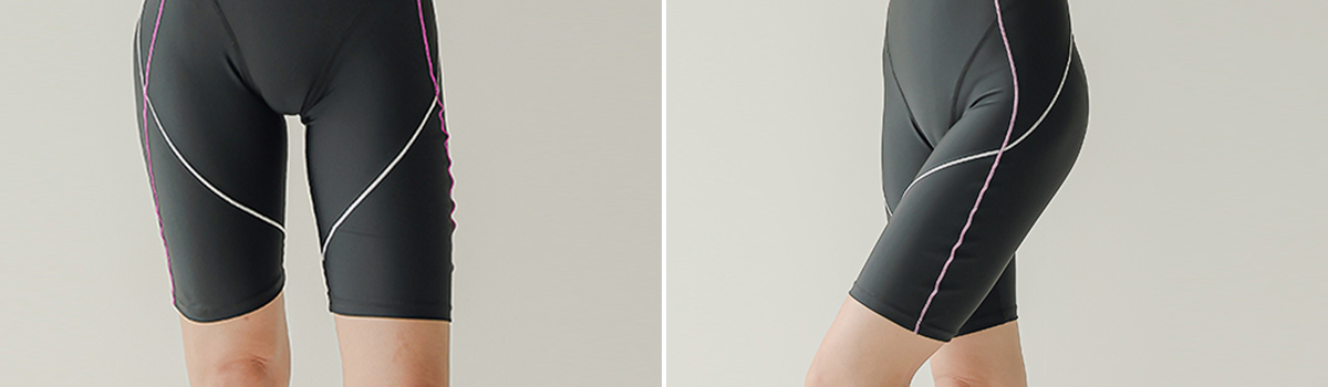 ノースリーブでありながら上品な印象を与える三分丈仕様と、黒地に施されたカラーの曲線ラインが、貴方のボディラインを美しく引き立てます。さらに、UVカット機能付きで、紫外線から肌を守ります。