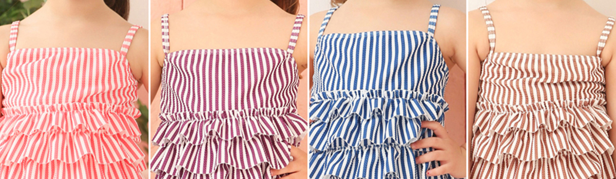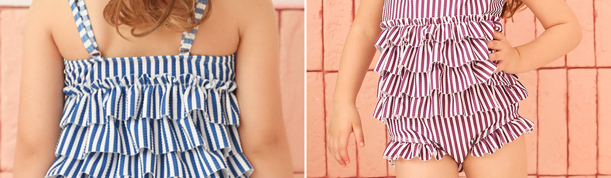 夏の陽射しに映える、ストライプ柄フリルワンピースKIDSキッズ水着が登場!ウエスト周りには四段のガーリーなフリルが施され、裾にも同様のフリルが広がります。