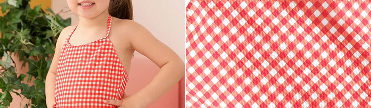 ギンガムチェック柄二段フリルワンピースKIDSキッズ水着は、腰周りに配された可愛らしい二段フリルとホルターネックが特徴的なアイテムです。そのディテールの細部にまでこだわったデザインは、お子様にぴったりの女の子らしい水着として大人気です。