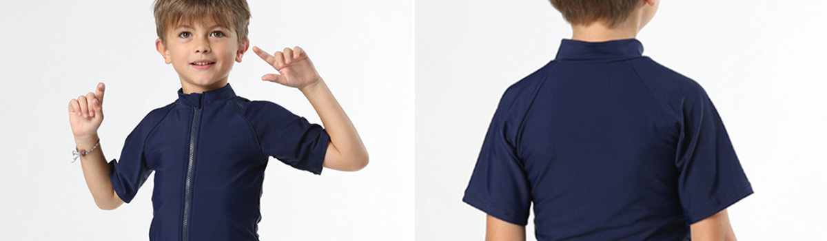 男女兼用のフロントファスナー半袖ラッシュガード2点セットが登場しました!無地のシンプルなデザインで、どんな水着とも相性抜群です。さらに、インパンが付いているので、お子様の動きを気にせず安心して遊べます。