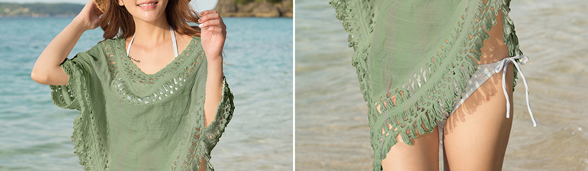 クロシェ編みが施されたこのポンチョ風トップスは、水着やビーチウェアとして大活躍間違いなし!独特な編み目が施されたフロントやバックは、上品で個性的なデザインが魅力です。