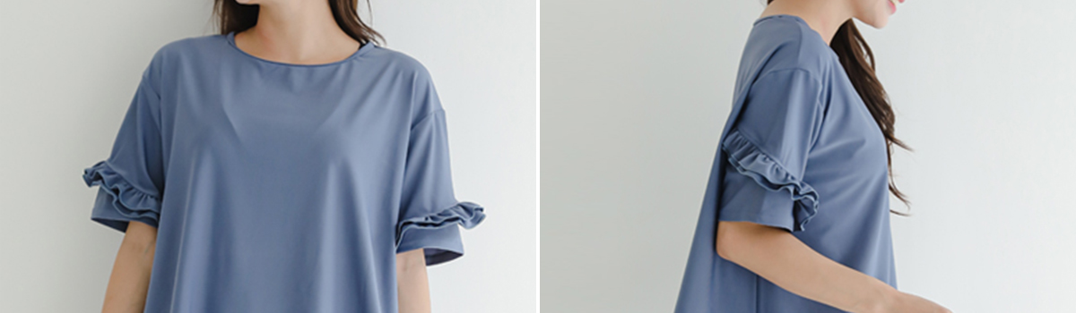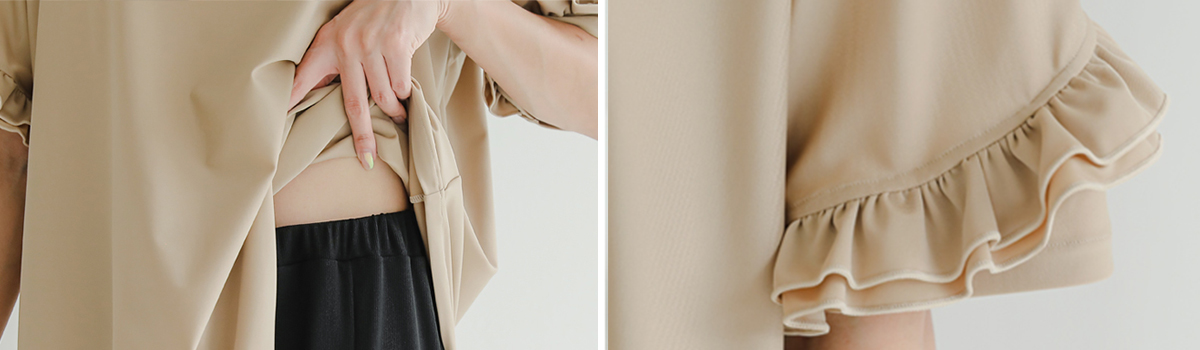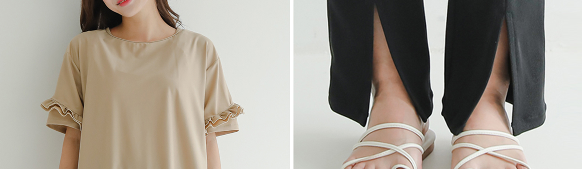 まるでカジュアルウェアなセンタースリットパンツとフリルスリーブデザインラッシュガードのセットアイテムです。