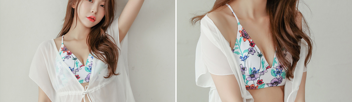 この3点セットは、ブラ、ショーツ、そしてシースルートップスがセットになっており、トレンド感満載で魅力的なデザインです。花柄の華やかさとシースルーのセクシーさが融合し、ビーチやプールサイドで存在感抜群です。