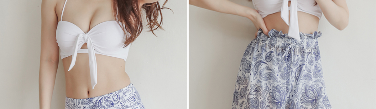 この爽やかペイズリーのワイドパンツ付きビキニ3点セットは、水着とビーチウェアが一緒になった嬉しいアイテムです。無地のフロントリボンホルターネックブラは女性らしいシルエットを演出し、ペイズリー柄のハイウエストパンツとワイドパンツはトレンド感満載です。