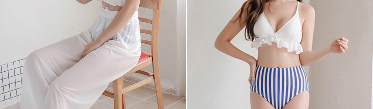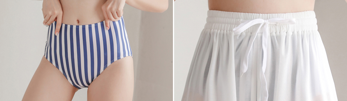 ブルーストライプがカジュアルなロングパンツ付きバイカラービキニ3点セットは、魅力満載のアイテムです。無地のアンダーフリルブラは可愛らしさを引き立て、胸元にフェミニンな雰囲気を演出します。